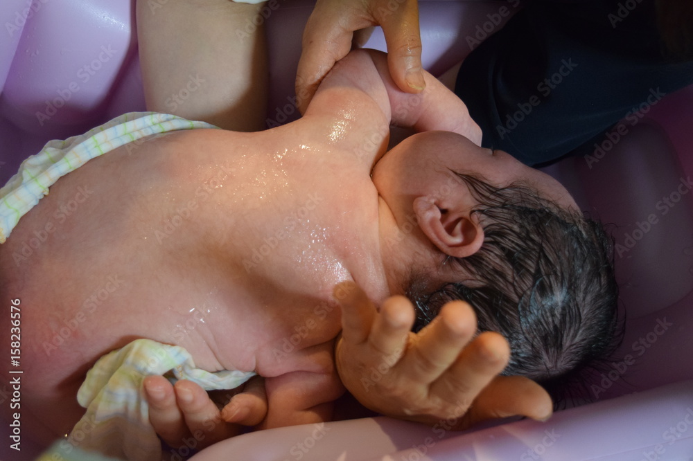 Foto 赤ちゃん お風呂に入る 男の子 生後28日 do StockAdobe Stock。