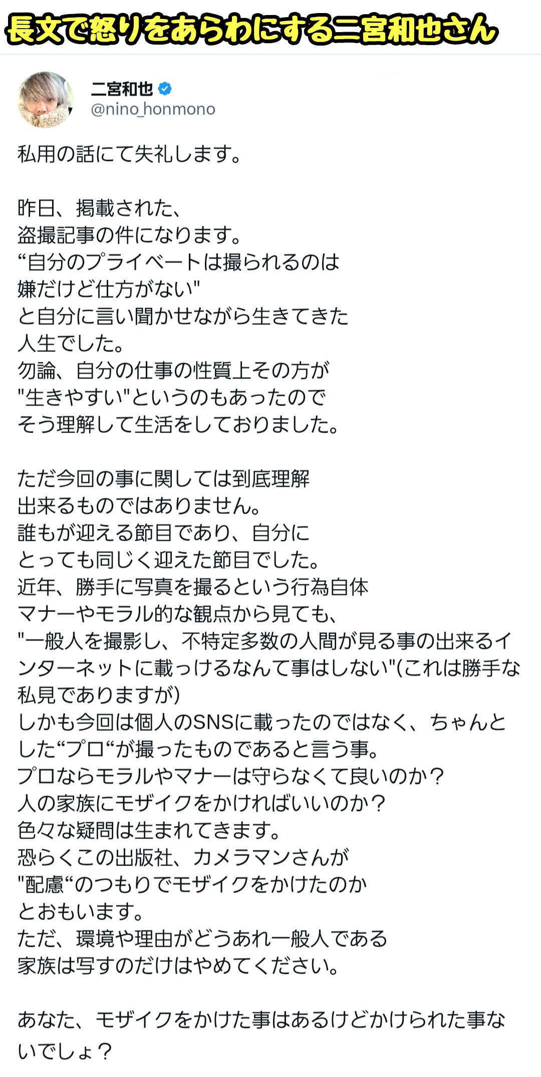 二宮和也が家族の盗撮に苦言 「到底理解出来るものではありません」 – grapeグレイプ。