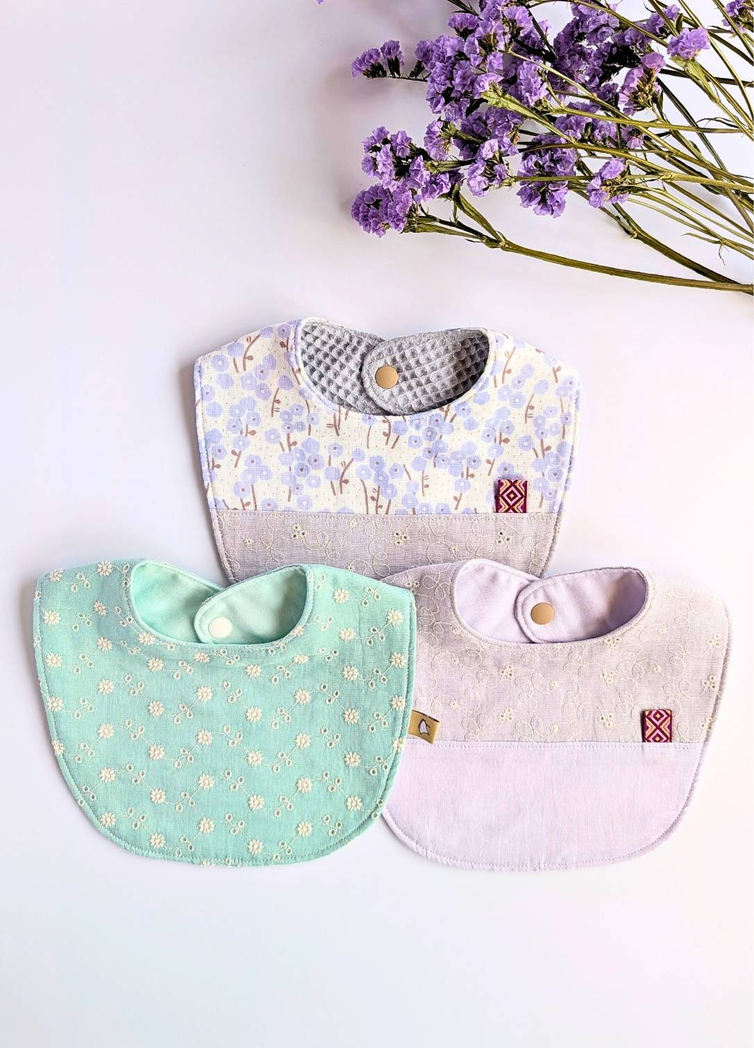 刺繍生地とダブルガーゼで作る 上品スタイベビーのもくもくスタイを作りました♪縫いのくらし I ベビー服・こども服の型紙 ラ・スーラ。