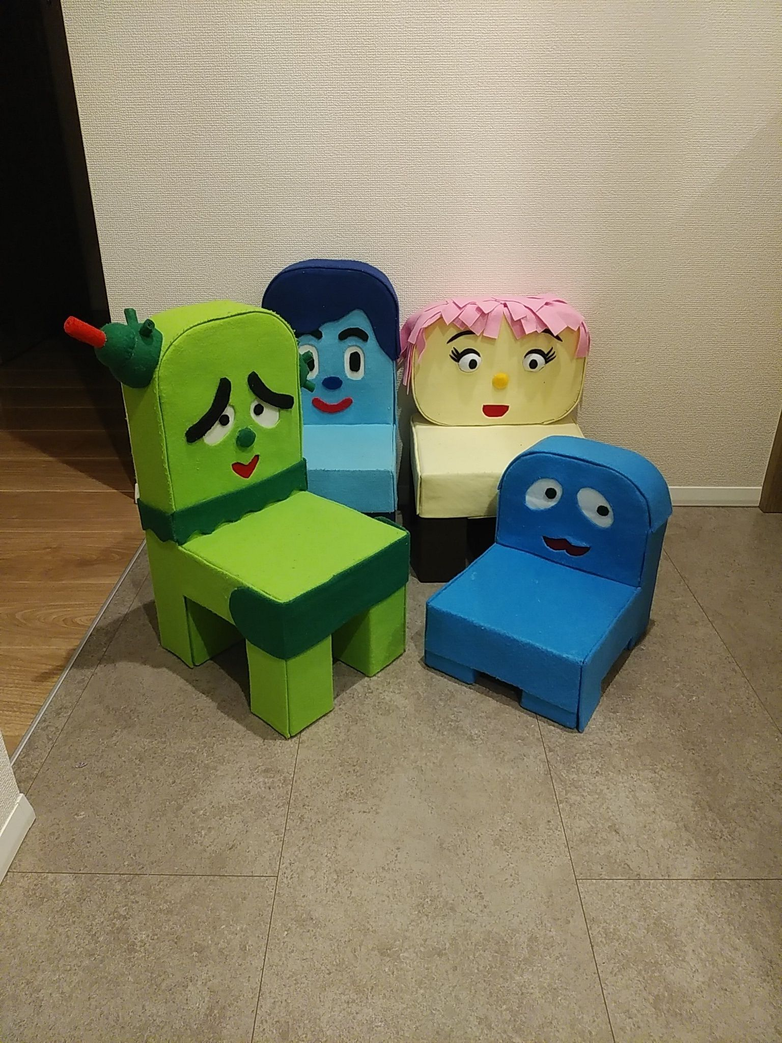 みゆき保育所 手作りイス 牛乳パックを使い、アンパンマンのイスを作りました。子どもたちは、みんなアンパンマンが大好きです💕子どもたちの喜ぶ顔を想像し、ワクワクしながら作りました😊 1つのイスを作るのに、牛乳パックを66本使いました。 今、テーブルも制作中。