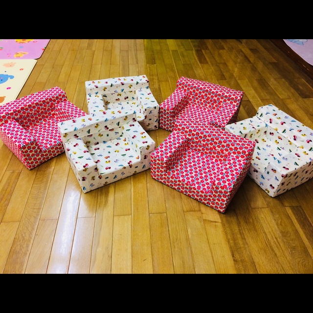 牛乳パックの廃材を使い、椅子を作りました! 椅子として使ったり、積み木やアスレチックにもなります。 子ども達自身で様々な遊び方を見つけていますよ。なないろこども園熊本市子ども手作り玩具。
