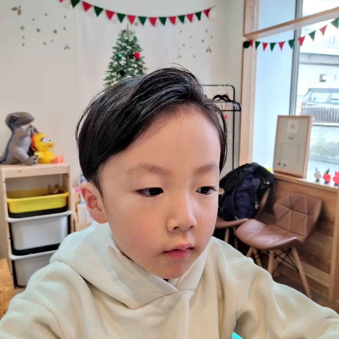 キッズカット 。 ツーブロックで前髪はちょっと長めに残す。 とってもイケメンボーイ君でした♡ またゆっくりきてね〜!!キッズカット年長さんツーブロック家族で通える美容室坂の途中赤いテント水色タイルお支払いは現金のみ駐車場はありませんママ。
