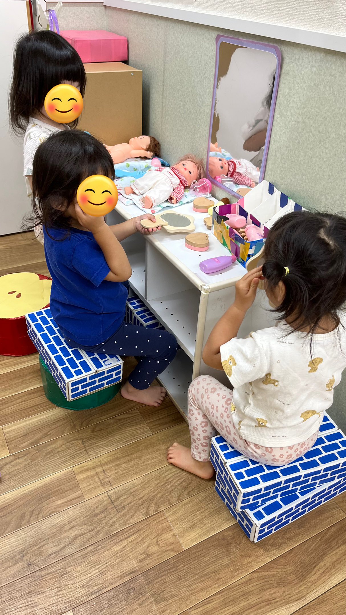 ⋆⸜ コーナー遊び ⸝⋆ おままごと、くつろぎ、メイクアップの3つのコーナーを作りました🏠 メイクアップコーナーのドレッサーはこれから、美容室にご協力いただきサロン使用のボトルたちを並べて本格的な仕上がりになる予定です ✨ それぞれの遊びたいところで。