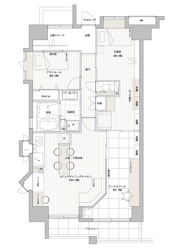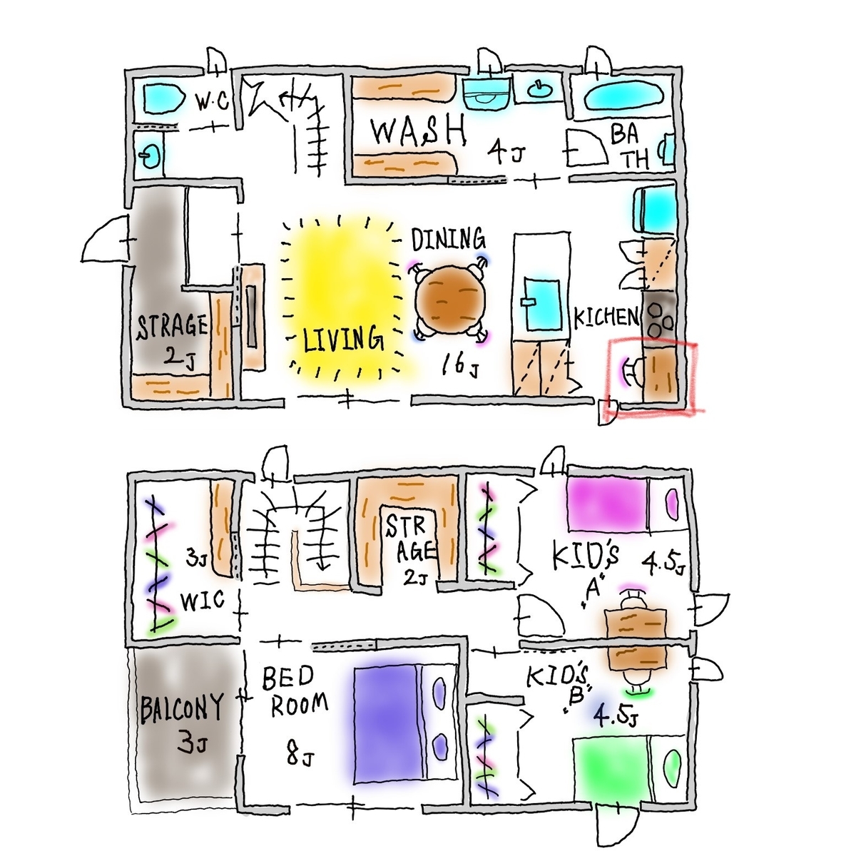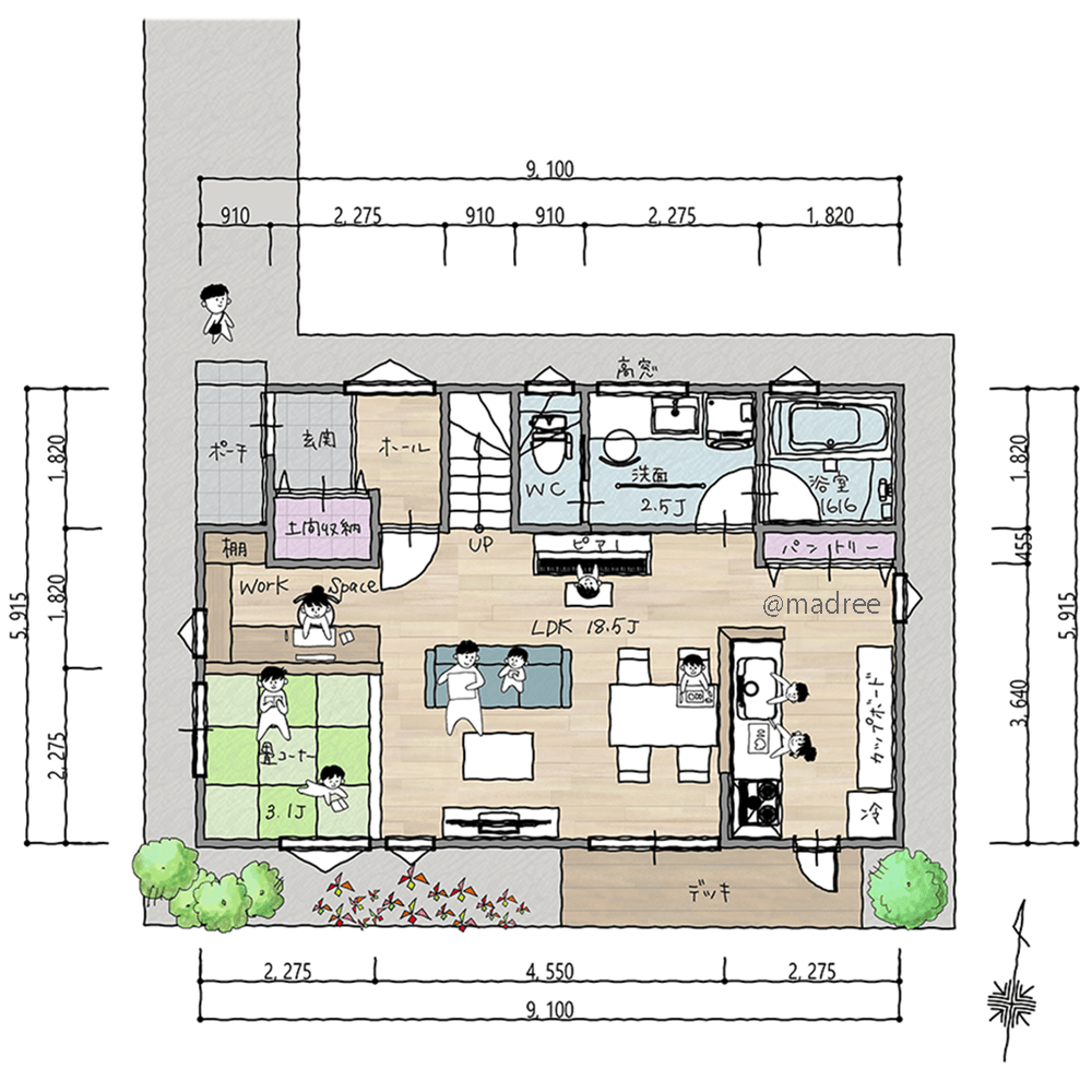 31坪 3LDK夫婦それぞれに働く環境を整える、在宅ワークも家事も集中できる篭り場のある家の間取り図「madree マドリー 」。