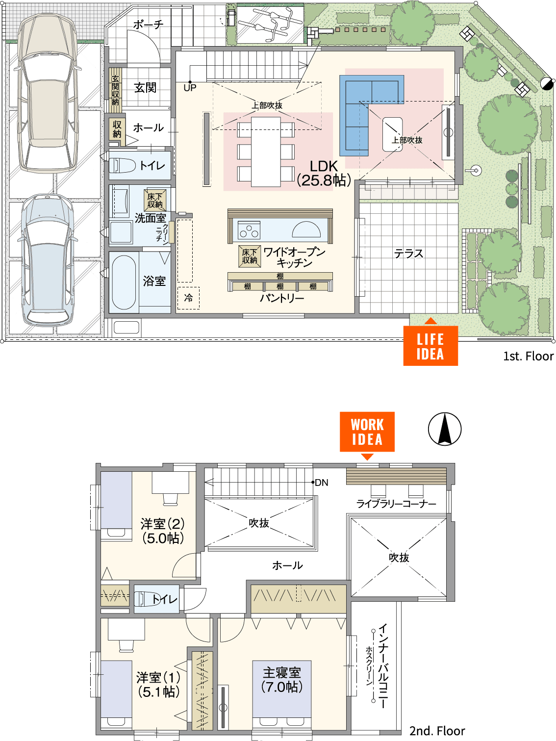 SUUMO32坪 夫婦 間取り図あり テレワークも快適、テラスとつながる開放的な吹き抜けリビングのある住まい - ダイワハウス の建築実例詳細注文住宅。