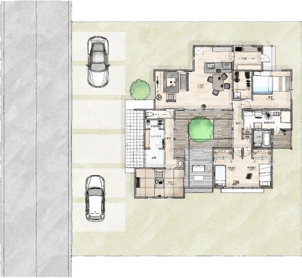 27坪〜30坪 2LDK気分でワークスペースをチョイス、同じ空間で自由なテレワーク夫婦の家の間取り図「madree マドリー 」。