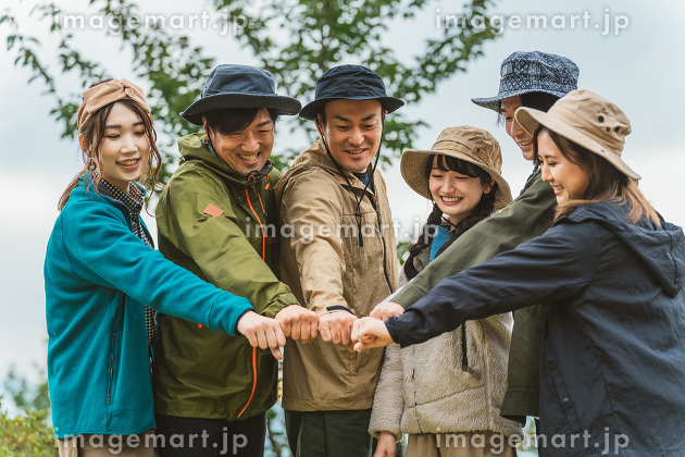 夏の公園で集合写真のポーズをとる陽気な友達。カジュアルな服を着た幸せな美しい若者の多様なグループが公園で出会い、楽しい時間を過ごし、一緒に楽しんでいますの写真素材・画像素材Image 188016461。