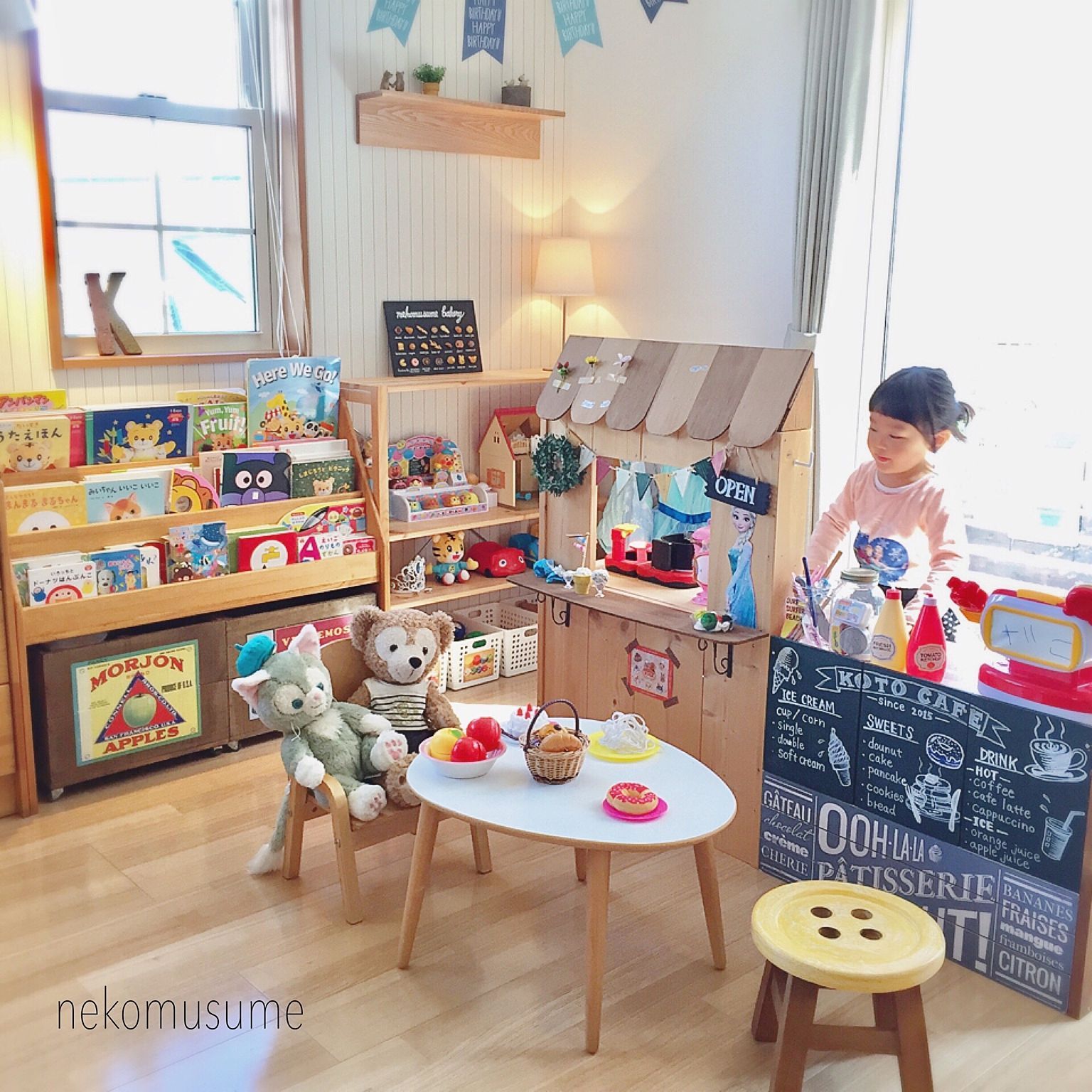 環境構成お部屋の模様替えをしましたˎˊ˗ 写真は部屋の一部のままごと・お世話コーナー* 生活の動線はなるべくそのままに遊びの環境は定期的に変化を持たせています☺️ まだまだやりたいことが たくさんあります、、!!!🥺❤️🔥 お店屋さんの棚は@sirokamone0。