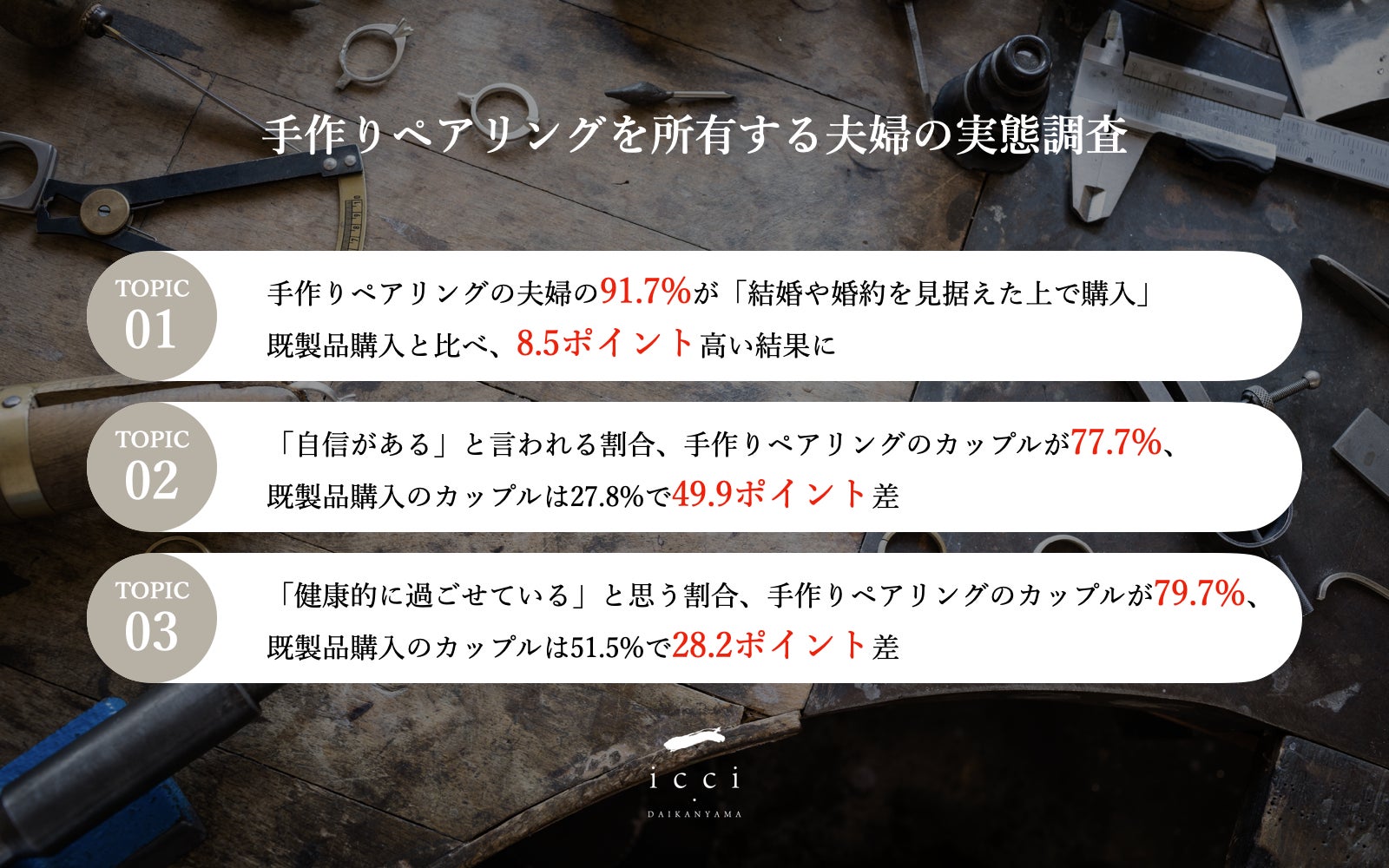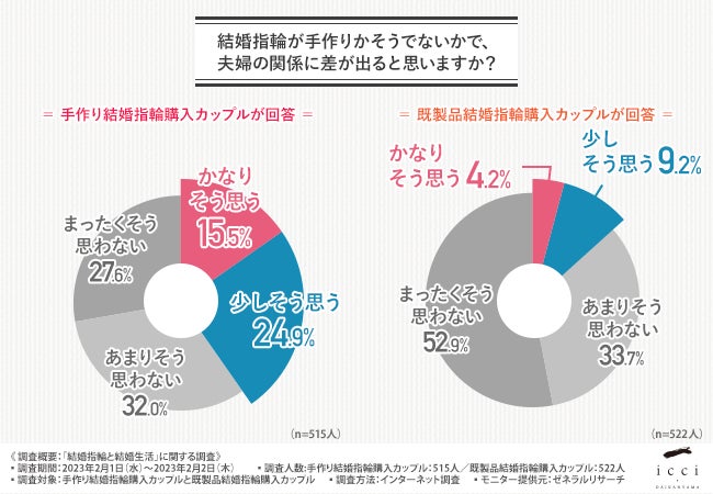 手作りペアリングと既製品、「婚姻率」に違いは? 手作りペアリングの夫婦の91.7%が「結婚や婚約を見据えた上で購入」、既製品購入と比べ、8.5ポイント高い結果に株式会社icciのプレスリリース。