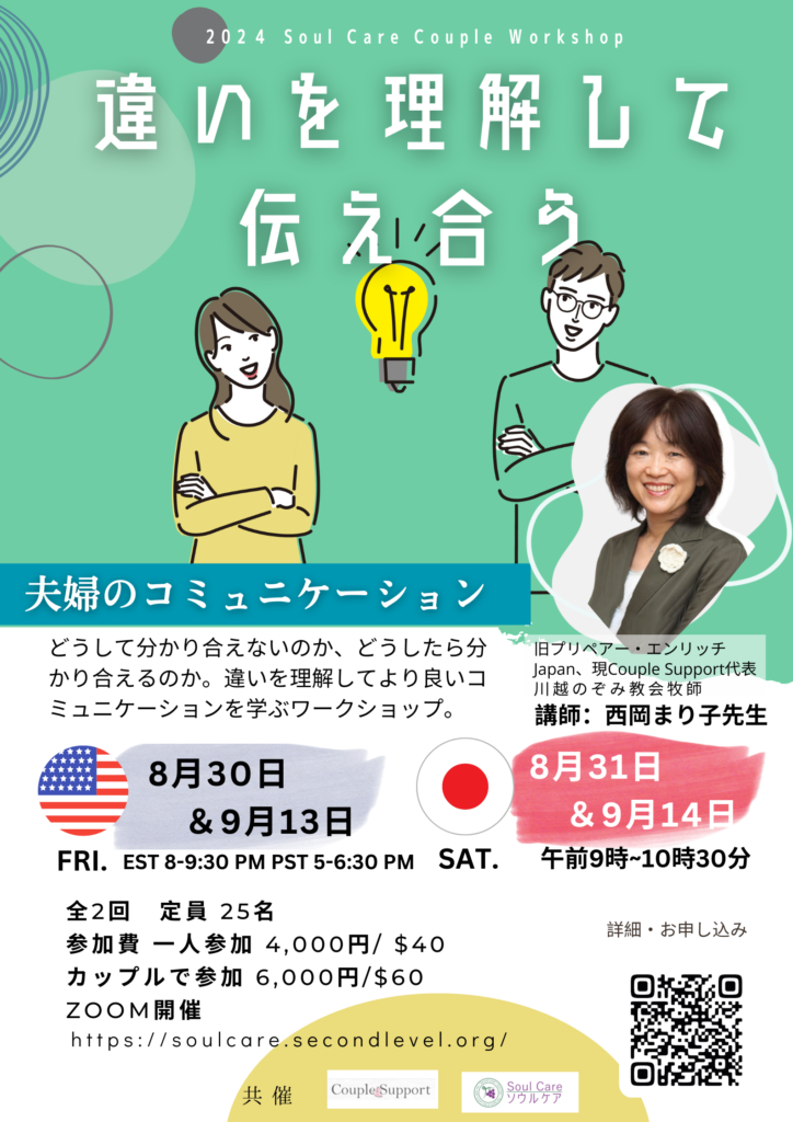 申込受付開始 2024年カップルワークショップ「違いを理解して伝え合う」全2回Soul Care Ministry。