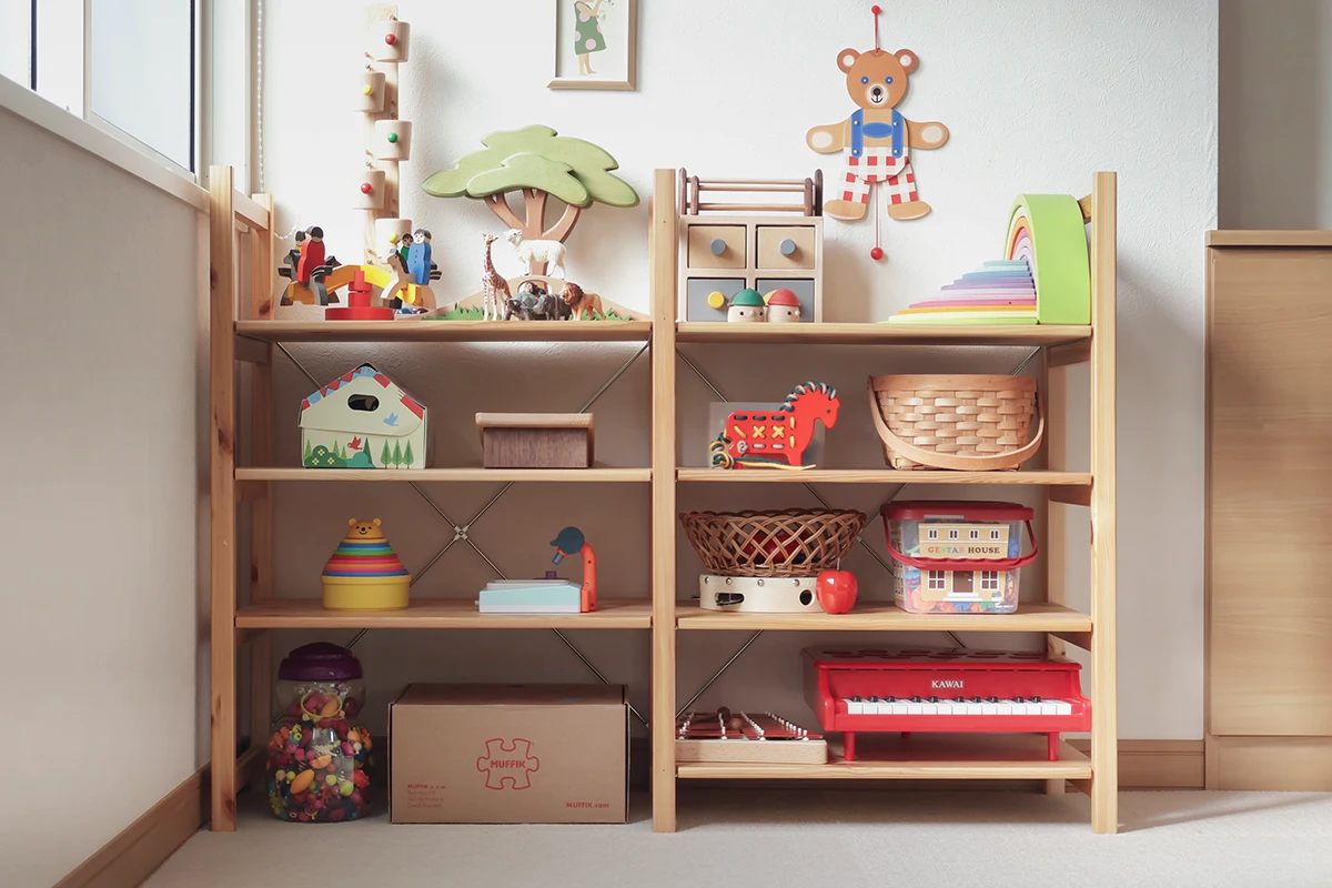 無印パイン材ユニットシェルフで子供のおもちゃを収納そぼくりっぷ。