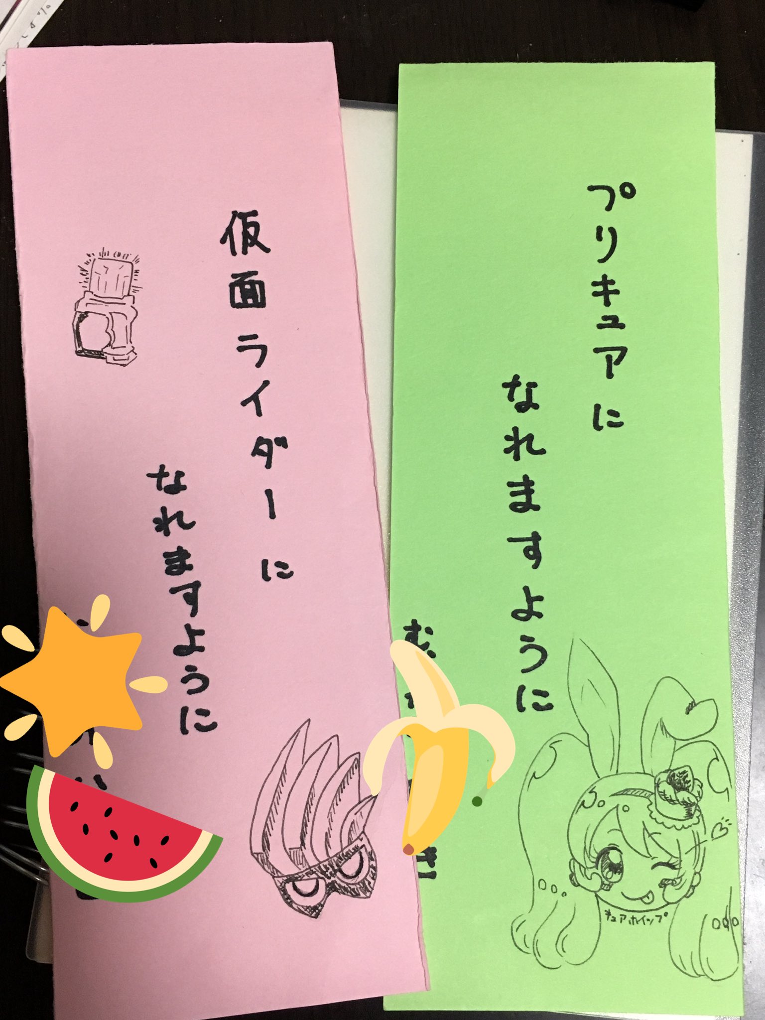 猫まぐろ@不在 on X: "保育園から七夕会の短冊に子供の願い事書いてやってくださいってきて息子に願い事は?って聞いたら返ってきたのがコレ。ライダーはまぁわかるよ けどさお前さん女子なの? https:t.co XofEU20Ua8"X。