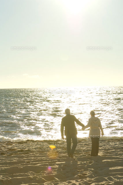 海辺を手をつないで歩くカップルの後ろ姿の写真素材FYI04760476ストックフォトの Qlean Market キュリンマーケット。