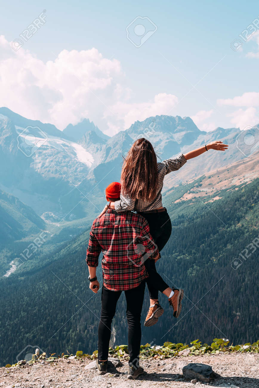 山の中の美しいカップル。山で恋をしているカップル、後ろ姿。男は女を腕に抱き上げた。カップルは山の間を旅します。山でのハイキング。コピースペースの写真素材・画像素材Image 157389169。