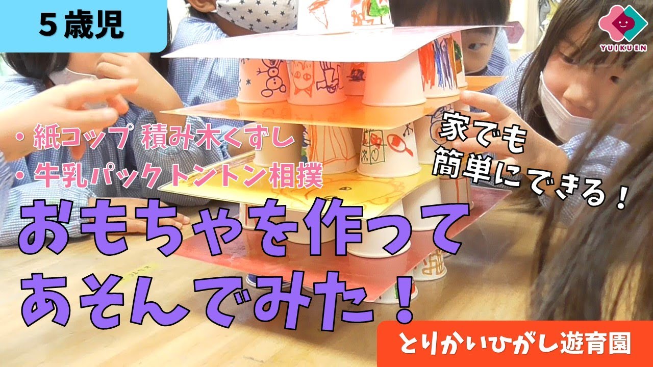 5歳児 お家でも簡単に作れる おもちゃを作ってあそんでみた! 紙コップ 積み木くずし・牛乳パック トントン相撲。