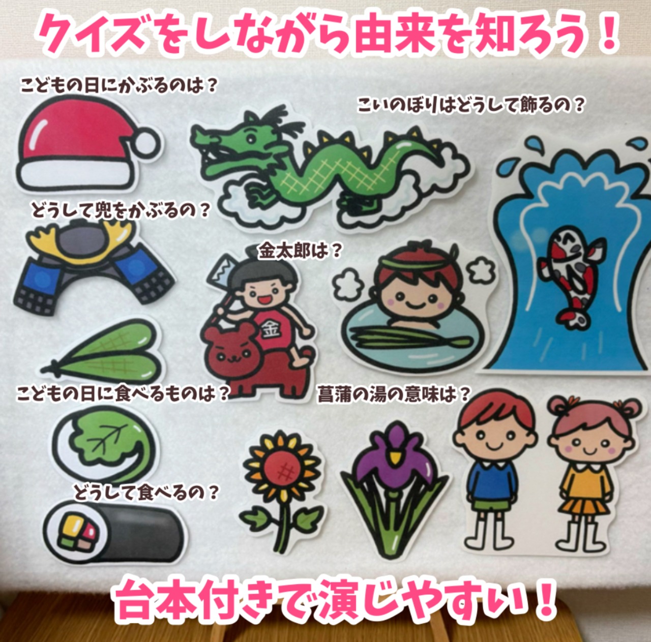 パネルシアター こどもの日のおはなしサイズ普通 カットなし端午の節句 新年度 新作 こどもの日クイズ スケッチブックシアター クイズ 3〜6歳向け端午の節句パネルシアター・スケッチブック 保育用品販売 risugumi。