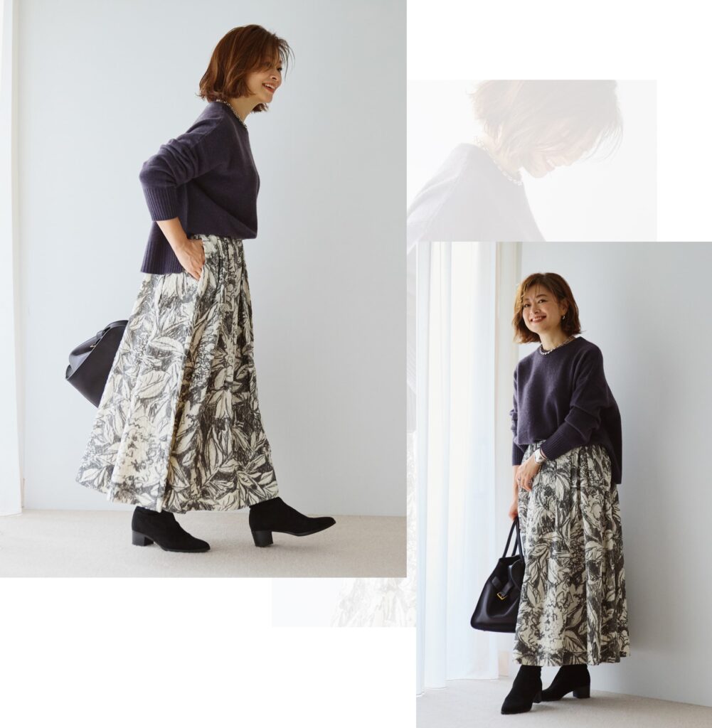 エディター三尋木奈保” これからの季節はこう着たい!三尋木奈保さんが提案するリラックス感がありつつも華やかな秋冬スタイルのご紹介。 リーフ柄スカートスタイルコート合わせ 「コートを羽織るとこんな感じ。 スカートの裾が少し出ますが、さらりと。
