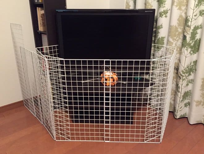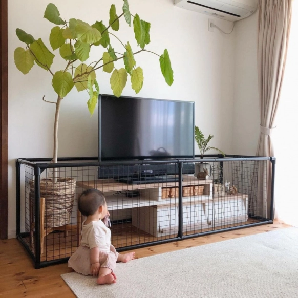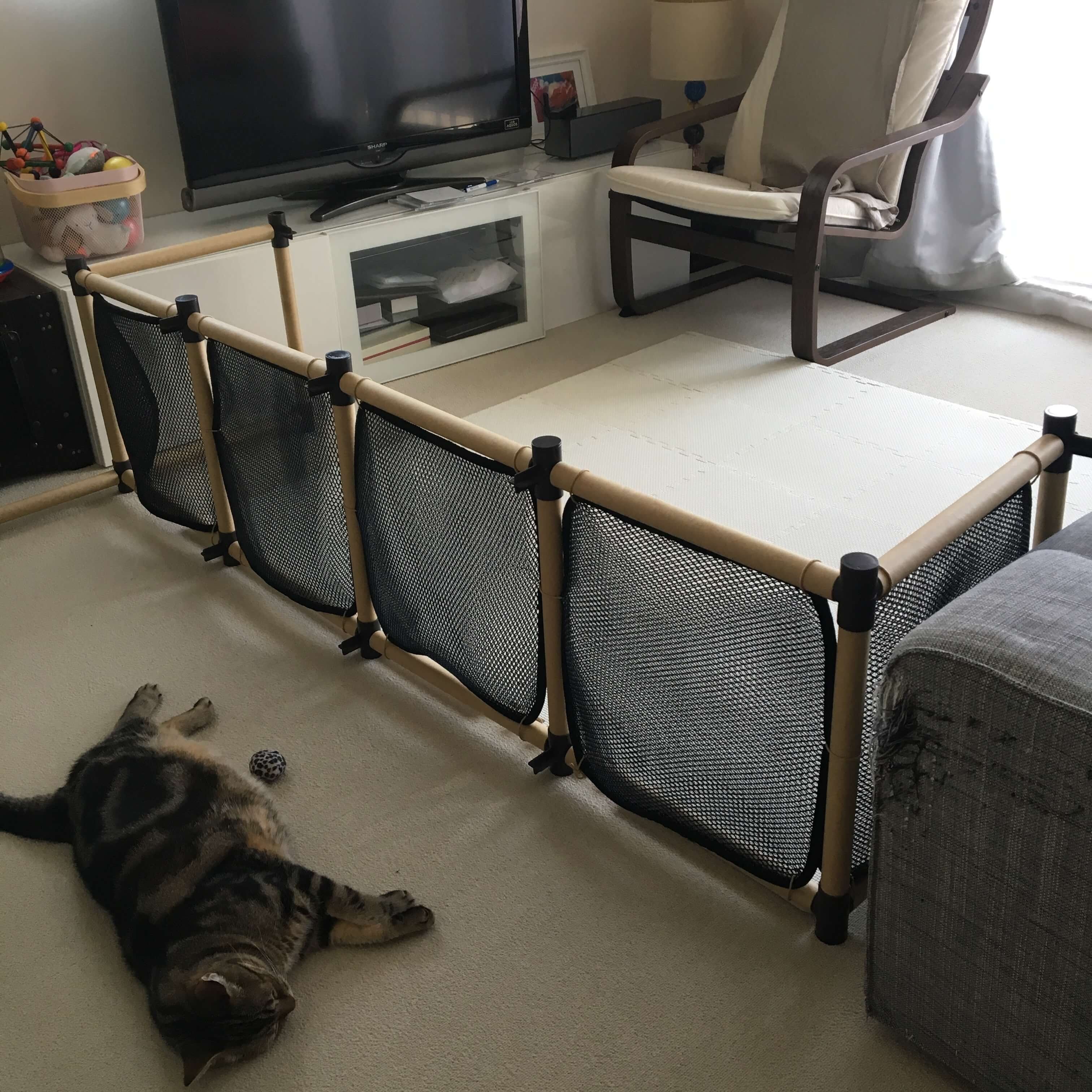 テレビ前にベビーゲートをDIYで自作する方法や費用、所要時間イレクターパイプ&100均の金網。