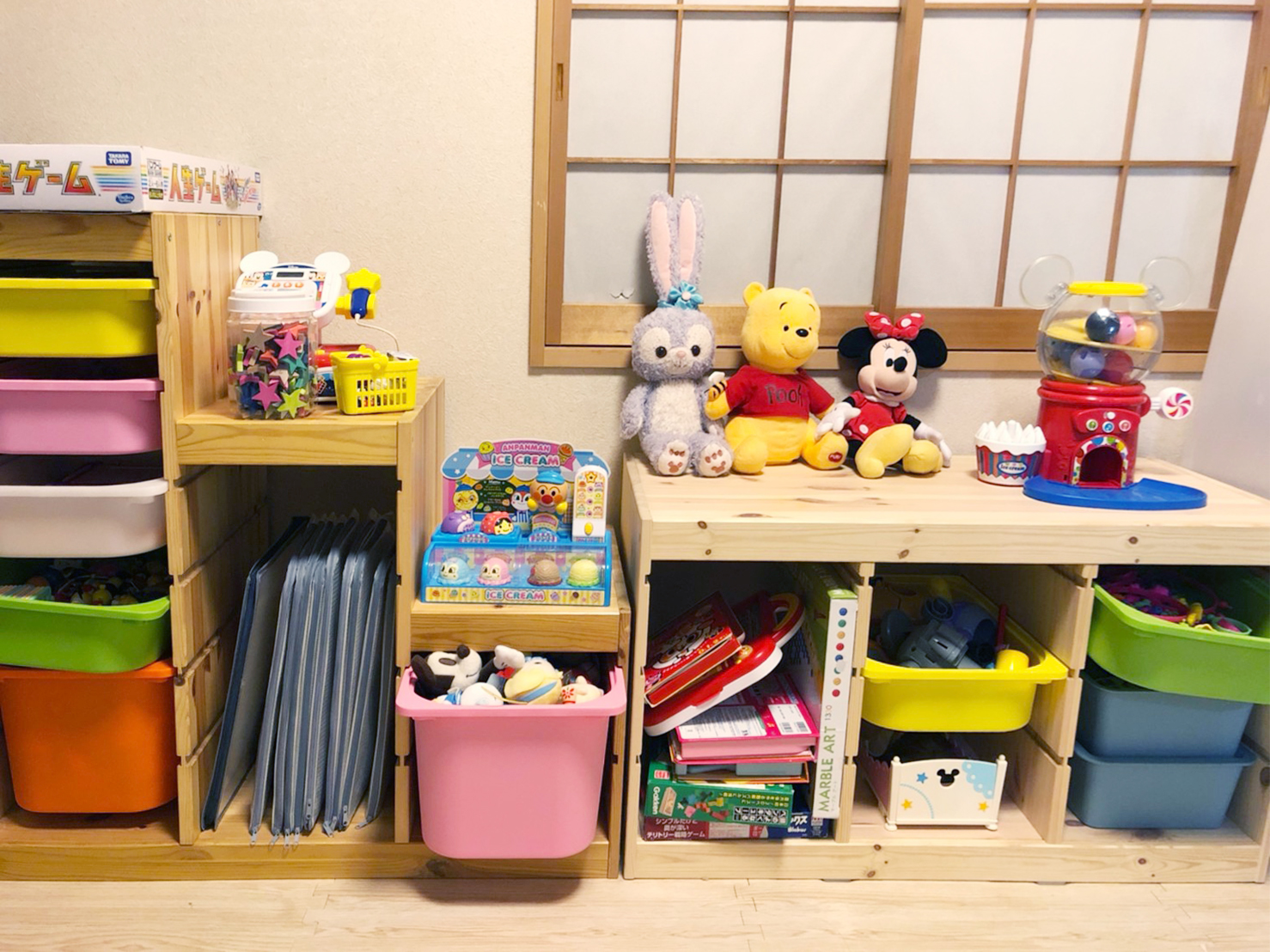 赤ちゃん部屋の収納棚 おもちゃ箱 可愛い 子供 おしゃれ 小物 収納 おもちゃ収納 シルバニア収納。