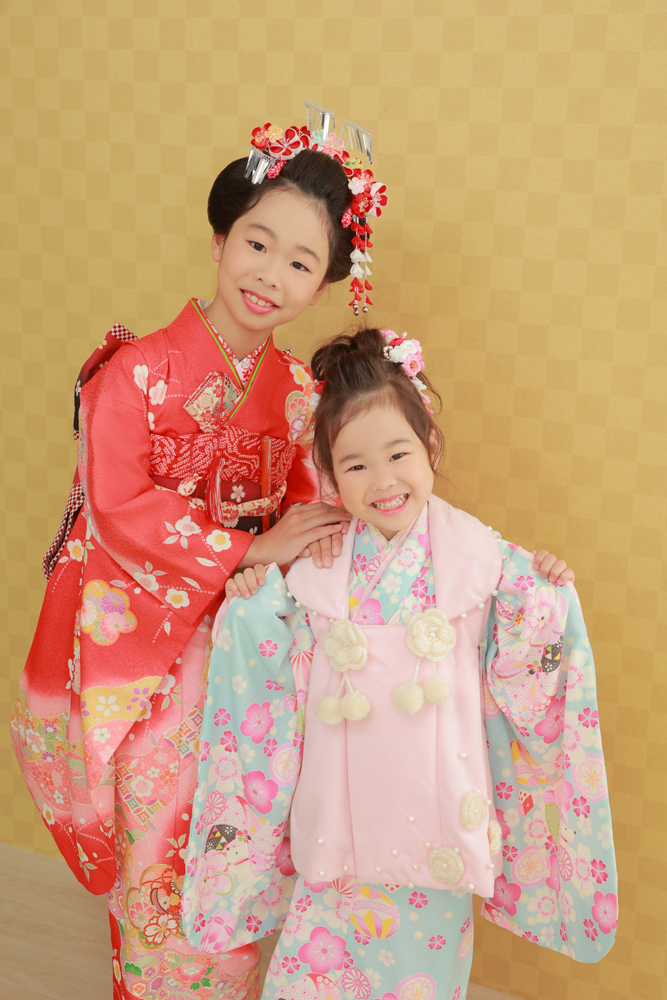 七五三 仲良し7歳、3歳の姉妹をご紹介!着物姿ではスッキリ前髪アップのヘアスタイルでいつもとは違う雰囲気に!トータルフォトスタジオトマト栃木県小山市の写真館です。七五三、お宮参り、成人式はトマトへ。
