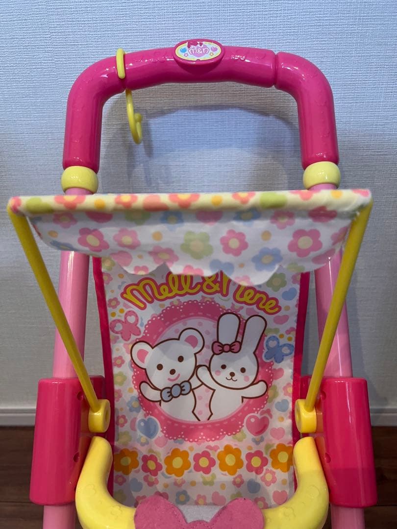 おせわだいすきベビーカー . メルちゃんたち専用のベビーカーは、折りたたみもできる本格派! ほんものそっくりで、どこにいくのも 楽しくなっちゃう♪こうえんで おともだちに ばったりであったら、かわいいお人形さんどうしで ごあいさつ しましょ🩷メルちゃん。
