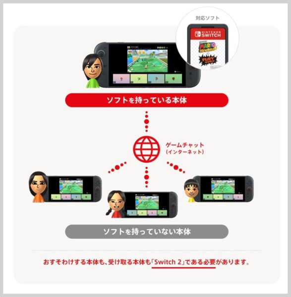 Switch 2の新機能「おすそわけ通信」って何?ローカルとインターネット経由、2つの方法あり。対応ソフトは6本Nintendo Switch2 ナビ 非公式。