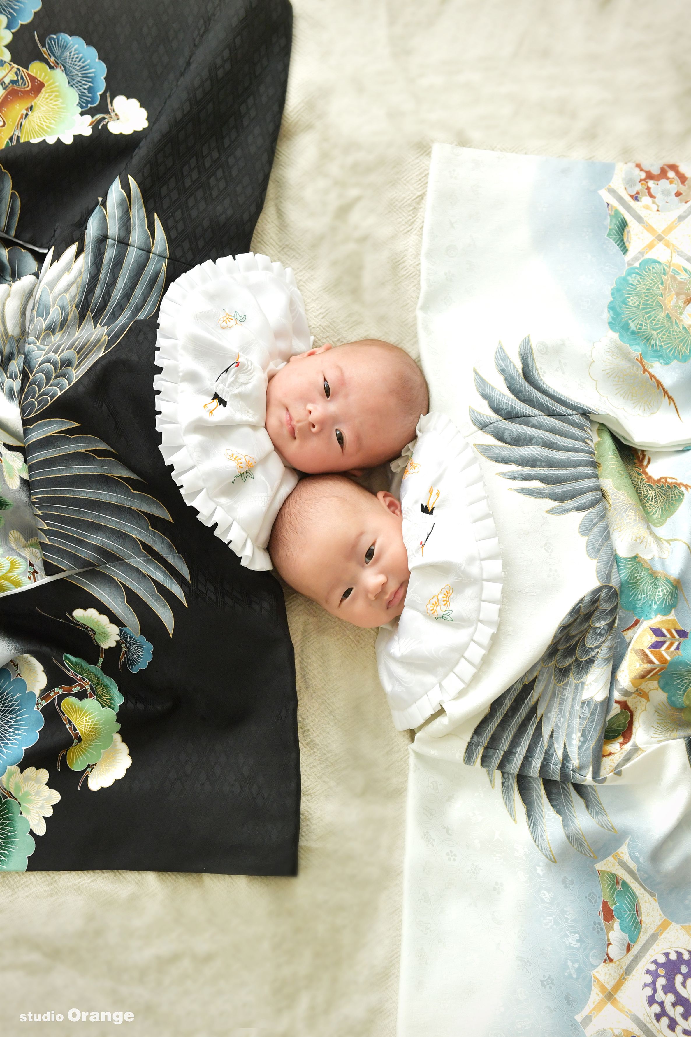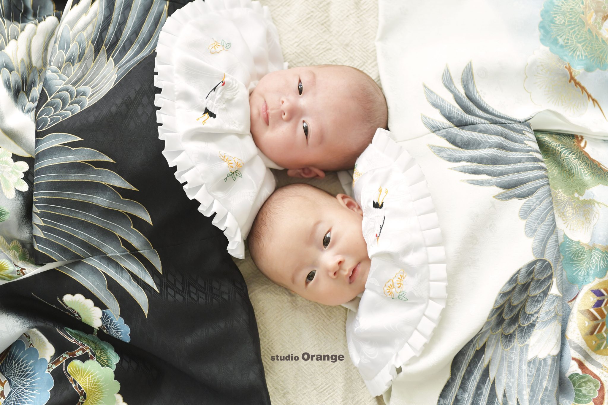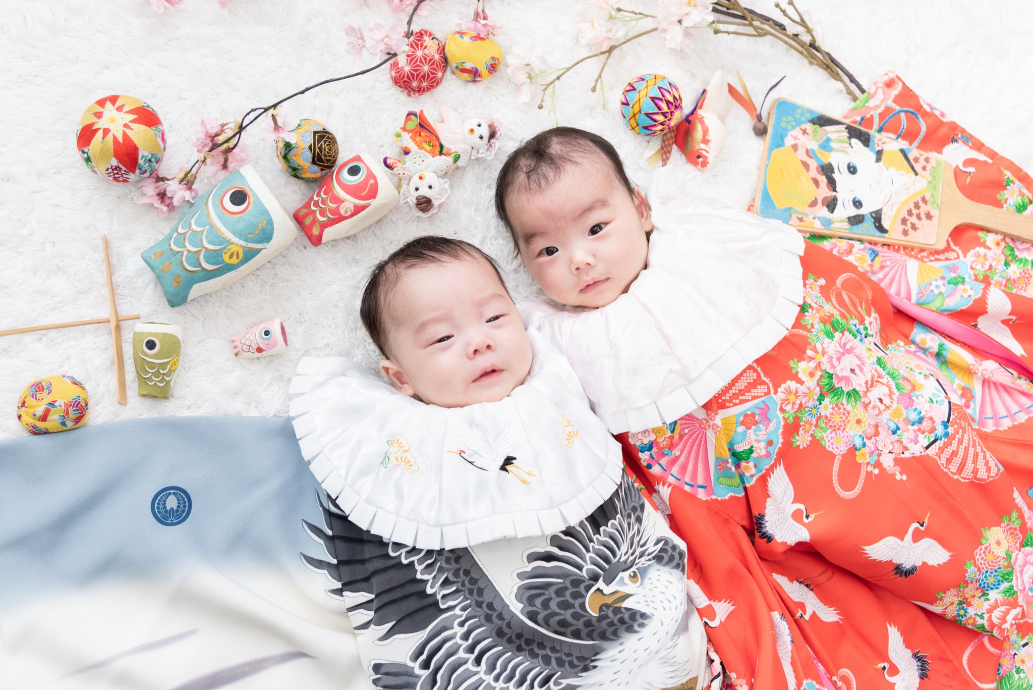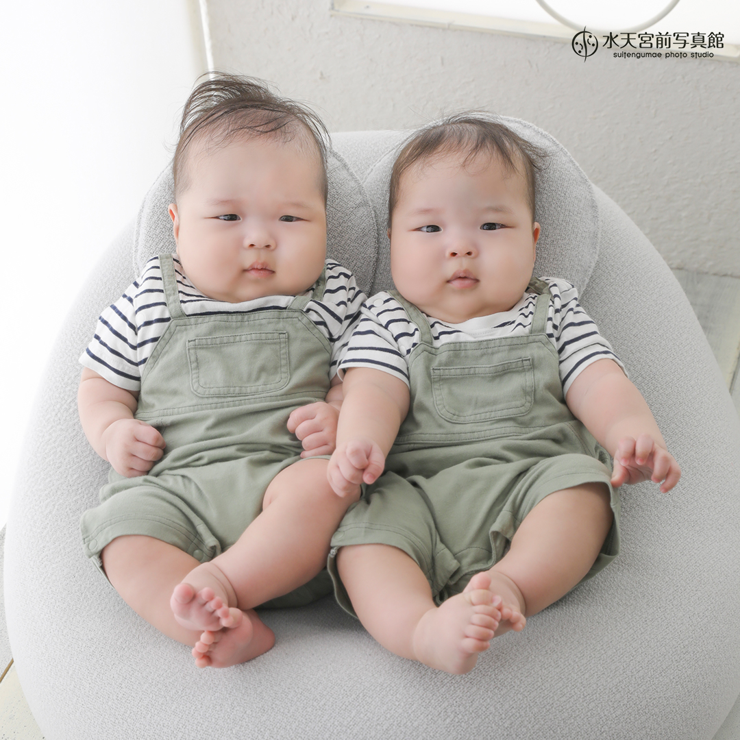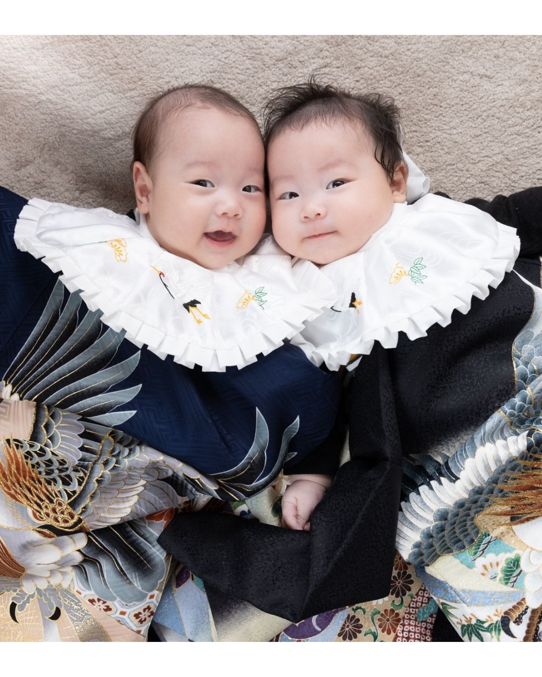 双子お宮参り写真1月生まれの双子ちゃんがお宮参り撮影でご来店🏡2人ともスヤスヤ夢の中です^^衣装は「どれがいいかな」と見比べながら決めていきました ๑╹ω╹๑オムツシーンからスタート🎬交互にうつ伏せをしてパシャリ🌸右向きがクセでしたがまっすぐも上手でした。