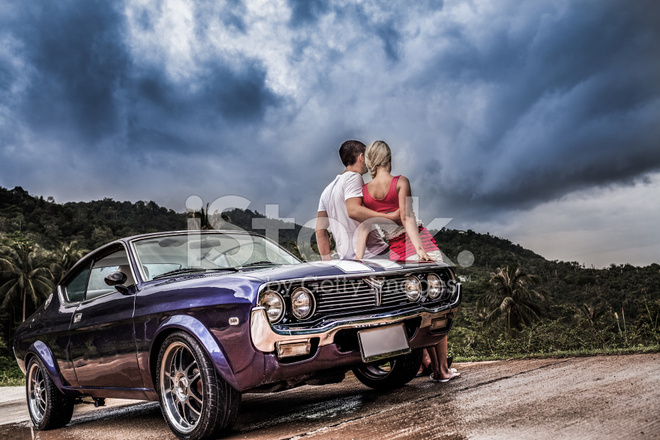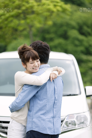 車の前で抱き合うカップルの写真素材FYI01305870ストックフォトの Qlean Market キュリンマーケット。