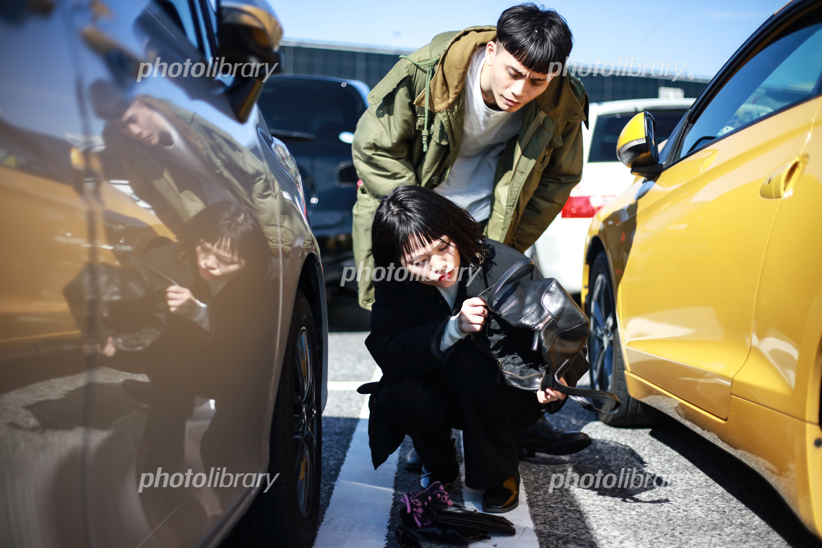 車の横でスマホを使う20代30代カップルの写真素材FYI02538920ストックフォトの Qlean Market キュリンマーケット。