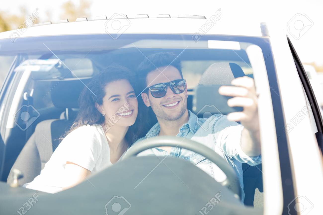 車を運転しながら携帯電話で自分撮りを取る若いカップルのフロントガラスから撮影の写真素材・画像素材 Image 97642661。