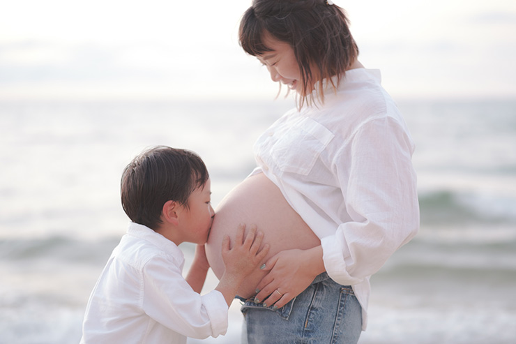 上の子と一緒に撮るマタニティフォト家族の絆を表現するポーズアイデア - フォトスタジオ 茨木・高槻家族写真・七五三・お宮参り・成人式・バースデー・マタニティLIFESIZE plan ライフサイズプラン。