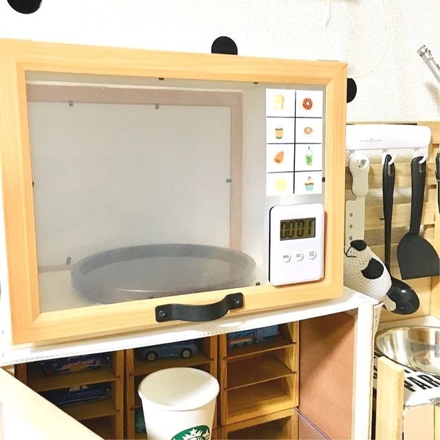 i_house.8 ▷ DIY好きのママです! ままごとが好きな息子のために、ままごと電子レンジをDIYしてみました!使ったのは100均とホームセンターの商品。まな板はまっすぐだし角がなくてそのまま使えたから時間削減になったかなと思います。😊フォトフレームもそのまま。