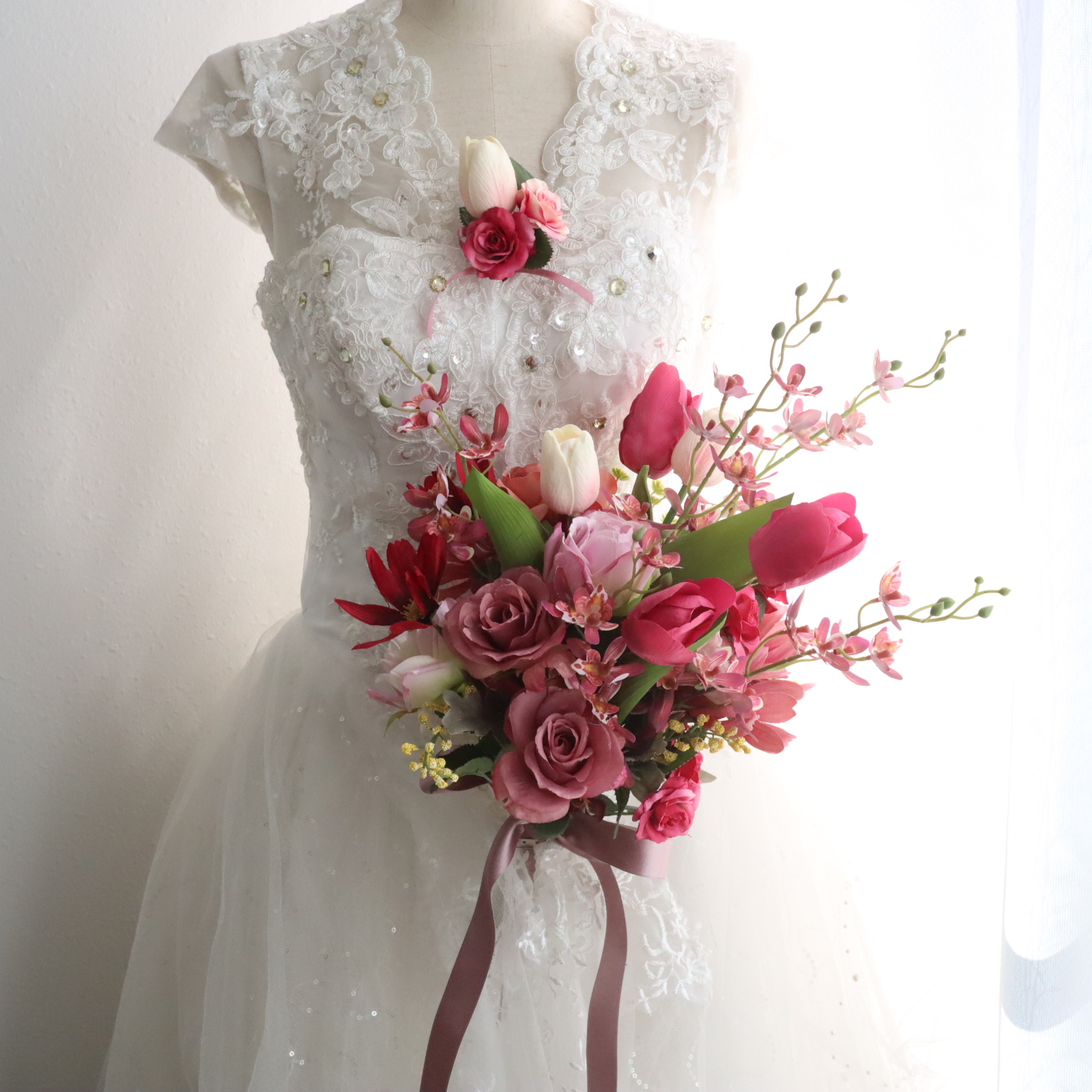 ピンクのブーケ クラッチブーケ 造花 ブーケ チューリップ 結婚式 前撮り ウェディング ウェディングブーケ ブライダル。