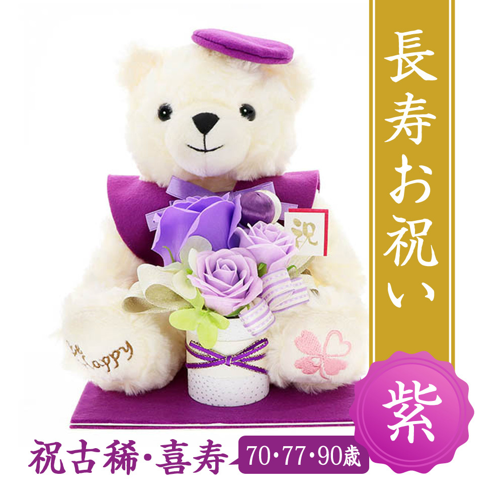 喜寿 77歳 長寿 お祝い ぬいぐるみ くま 花 敬老の日 プレゼント 誕生日 70歳 古希 紫色 母の日 卒寿 90歳 和風 花束 ソープフラワーメッセージカード のし 父の日 高齢者 老人ホーム シニア お年寄り 祖父 祖母 父親 母親 子 孫から。