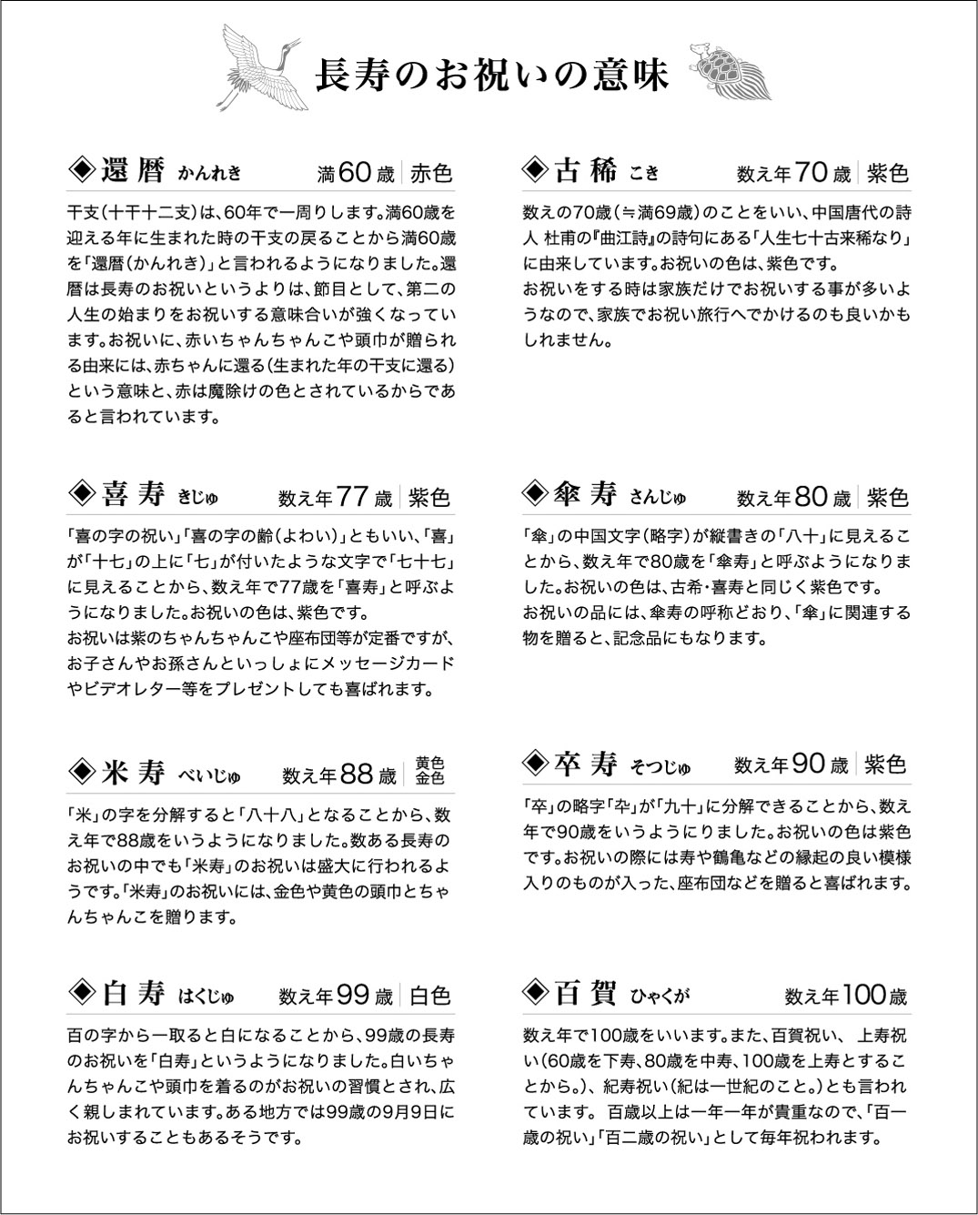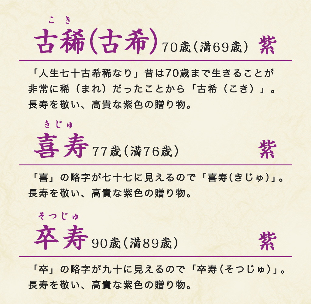 2025年版長寿祝い早見表。年齢や色、由来までお伝えします! – 槇田商店公式ショップ。