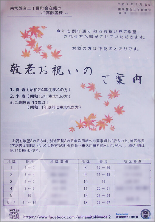 敬老お祝いのご案内 締切:令和7年9月10日南常盤台二丁目町会板橋区 - その他の地域のニュース、お知らせ。