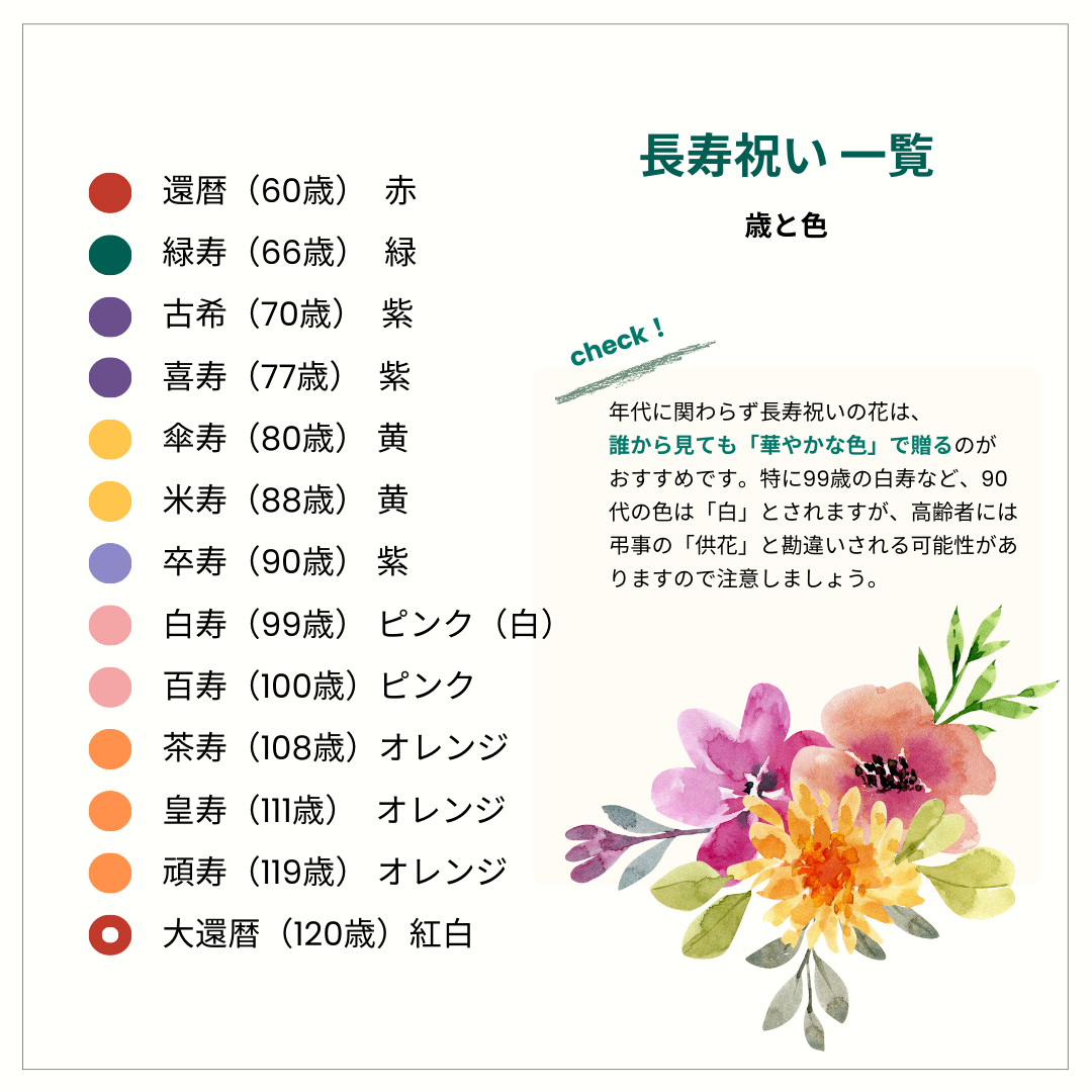 長寿祝いの色 一覧 還暦・古希・喜寿・傘寿・米寿・卒寿・白寿よくある質問おしゃれな神戸のお花屋さんグラウンドのコラム。
