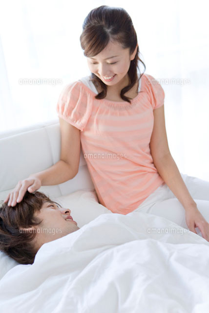 寝起きの男性の頭を撫でる笑顔の女性 28174010509 の写真・イラスト素材アマナイメージズ。