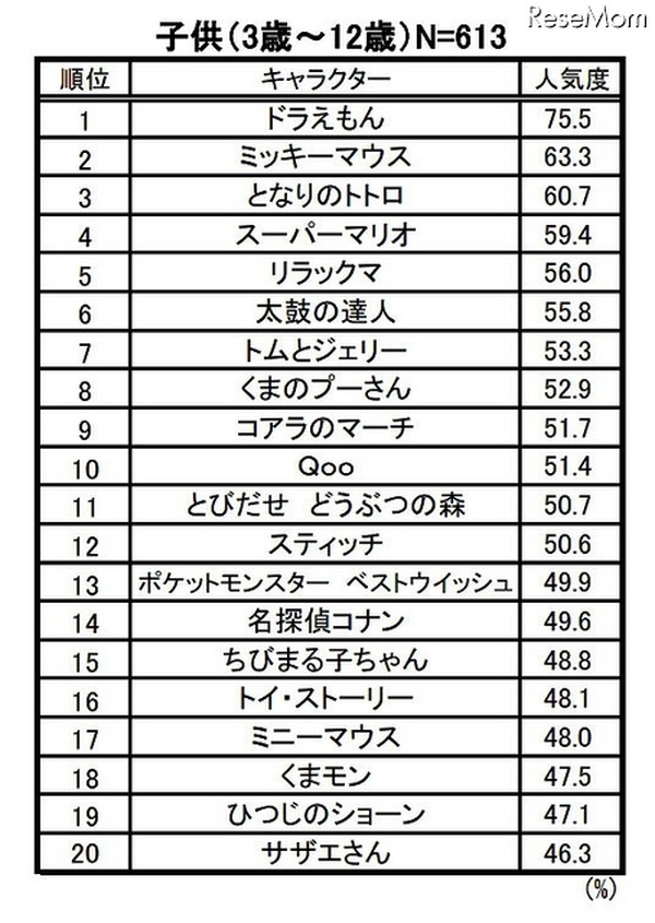 子供が選ぶ人気キャラクター1位にドラえもん 8回連続1位と安定の強さを誇示マイナビニュース。