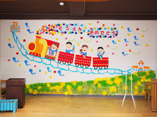 423壁面飾り壁面お誕生日おめでとう壁面電車壁面動物 雨の卒園。