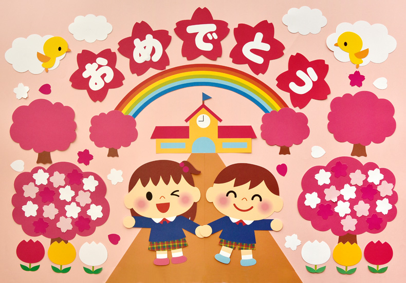 作品紹介 ☆壁面飾り工房横100cm 「入園・卒園おめでとう!」 3月 4月 春 入園式 卒園式 幼稚園 保育園 学校 病院 施設 知育 壁面装飾型紙 製作☆壁面飾り工房ブログ。