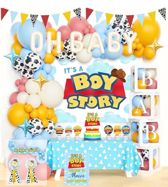 漫画のおもちゃのベビーシャワーデコレーション、138個 - 男の子の物語のベビーシャワーパーティー用品、おもちゃにインスパイアされた物語の背景、バルーンガーランド付き- Etsy 日本。