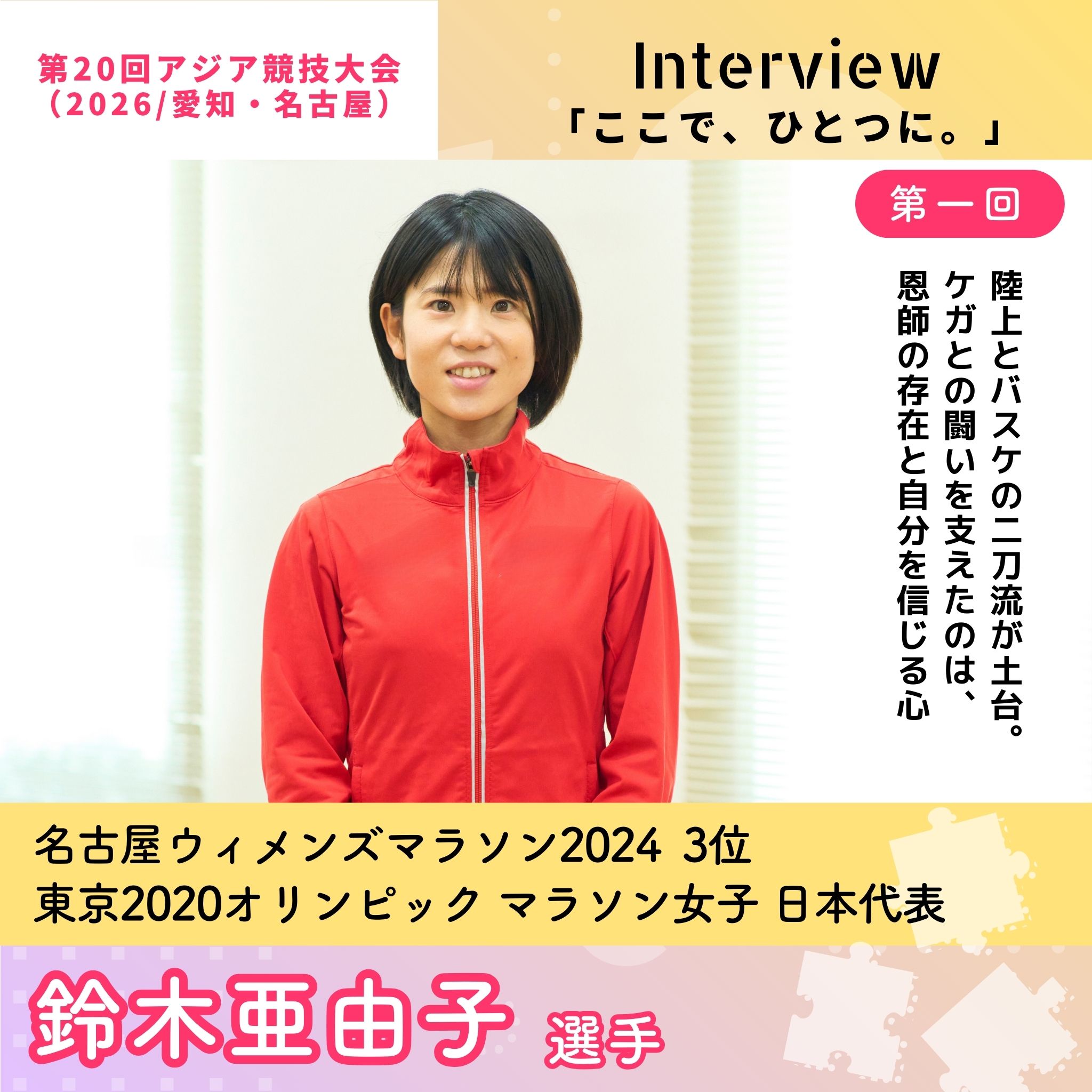 第一回 陸上とバスケの二刀流が土台。ケガとの闘いを支えたのは、恩師の存在と自分を信じる心 名古屋ウィメンズマラソン20243位・東京2020オリンピック マラソン女子 日本代表 鈴木亜由子選手ここで、ひとつに。 公式 第20回アジア競技大会 2026 愛知・名古屋。