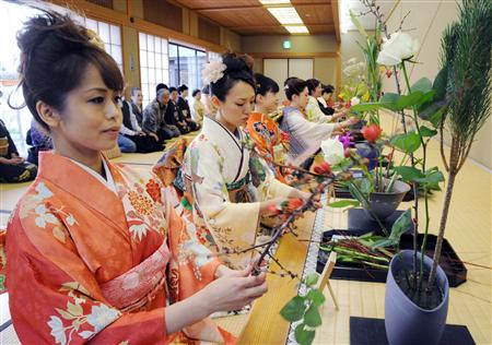 京都・池坊で初生け式 精進誓い、華やかに華道家元・池坊の「初生け式」で、花を生ける着物姿の女性ら=5日午前、京都市四国新聞社。