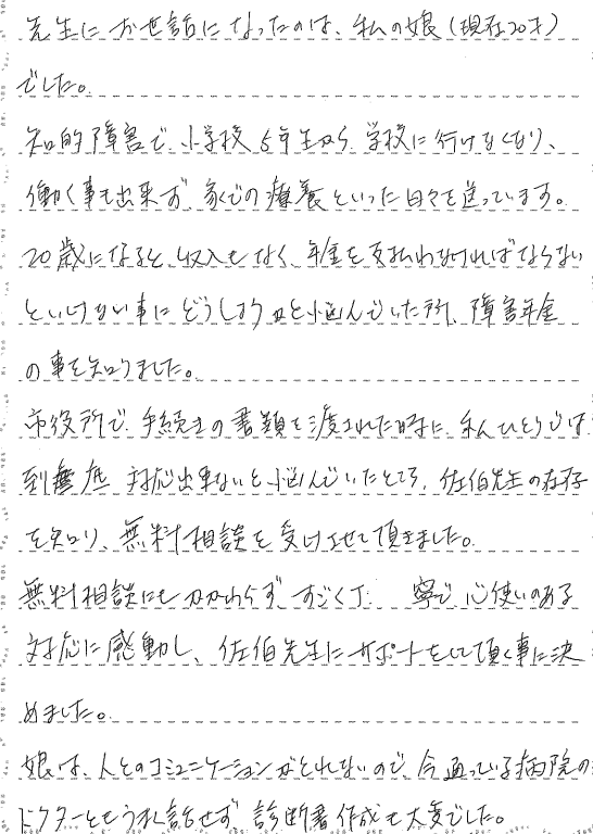 67 佐伯先生に出会い、佐伯先生にお任せして、本当に良かったと思います。 感謝の気持ちで一杯です。 言葉には出来ない程です。 知的障害・解離性障害兵庫で障害年金の申請なら兵庫・姫路・播磨障害年金相談センタ。