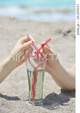 ビーチで寄り添いハート型のストローでドリンクを飲むカップルの写真素材16158895- PIXTA。