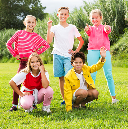 5 人の子供が公園でポーズをとる - 5人のストックフォトや画像を多数ご用意 - 5人, コミュニケーション, スペイン - iStock。