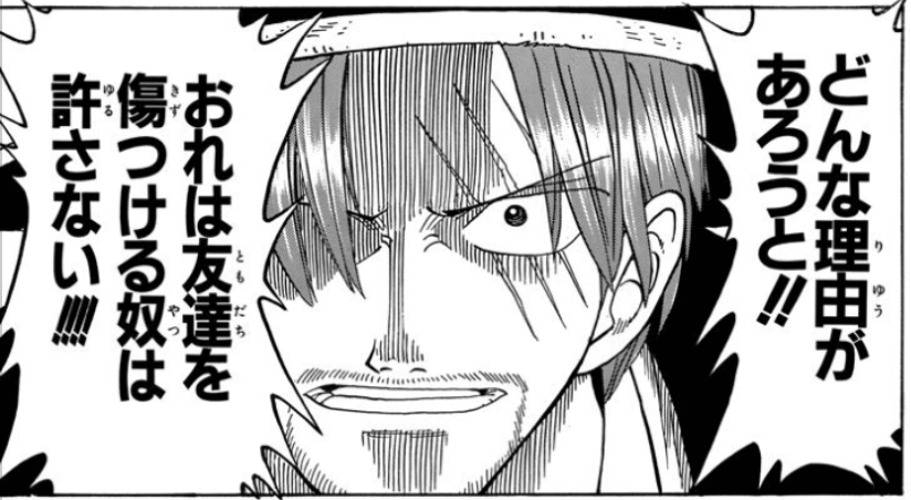 いいか山賊・ おれは酒や食い物を頭からぶっかけられようが つばを吐きかけられようが たいていの事は笑って見過ごしてやる・ だがな!!どんな理由があろうと!! おれは友達を傷つける奴は許さない!! ワンピース。