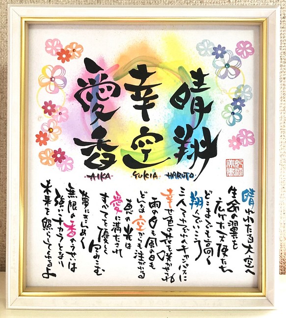 名前のポエム・ネームのポエム色紙額 カラフルハート 誕生日・結婚祝い。