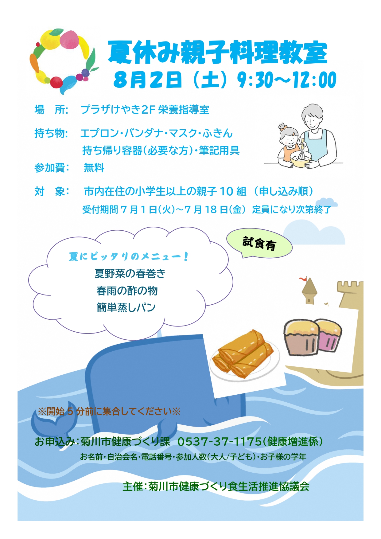 菊川市公式 on X: " 夏休み親子料理教室親子向け料理教室です。夏にぴったりの料理を紹介。 ぜひ参加ください。 □日時 8月2日午前9時30分~正午 ※開始5分前に集合 □会場 プラザけやき □定員 市内在住小学生以上の親子10組※先着、無料 □申込 7 18 17:00までに。